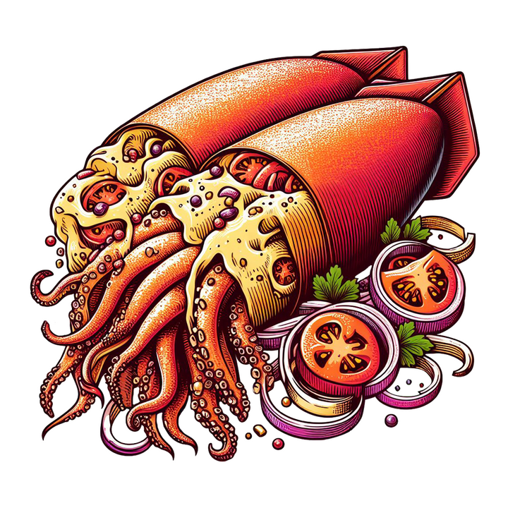 Calamari stuffed with onion, garlic, rice, tomatoes, salt, black pepper, mint leaves, parsley, squid, and tomato juice.